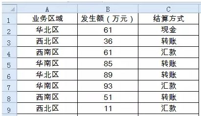 如下图所示,要计算“华南区”的“转账”的业务笔数。