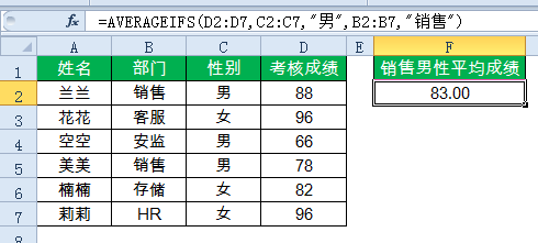 =AVERAGEIFS(D2:D7,C2:C7,”男”,B2:B7,”销售”)