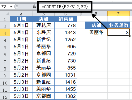 如下图,要统计指定店铺的业务笔数。也就是统计B列中有多少个指定的店铺名称。