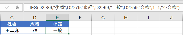 =IFS(D2>89,”优秀”,D2>79,”良好”,D2>69,”一般”,D2>59,”合格”,1=1,”不合格”)
