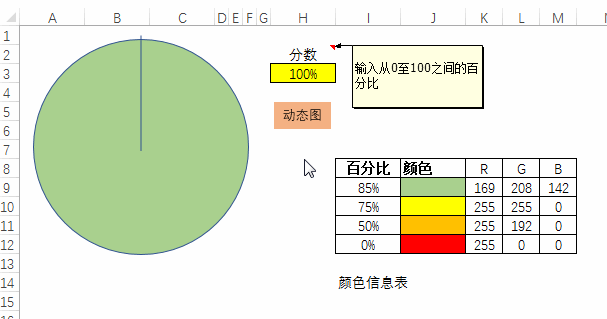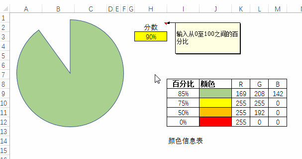 Private Sub Worksheet_Change(ByVal Target As Range) On Error GoTo errHandler Dim sh As Shape Dim myColor As Long Dim lAdj As Long Set sh = Shapes(“Partial Circle 1”) If Target.Address = “$H$3″ Then Application.EnableEvents = False sh.Adjustments.Item(1) = 0 Select Case Target.Value Case 0: lAdj = 0 Case Else: lAdj = -(360 – (360 * Target.Value)) End Select sh.Adjustments.Item(2) = lAdj ‘修改形状颜色 Select Case Target.Value Case Is >= 0.85: myColor _ = RGB(169, 208, 142) ‘绿色 Case Is >= 0.75: myColor _ = RGB(255, 255, 0) ‘黄色 Case Is >= 0.5: myColor _ = RGB(255, 192, 0) ‘橙色 Case Else: myColor _ = RGB(255, 0, 0) ‘红色 End Select sh.Fill.ForeColor.RGB = myColor End If exitHandler: Application.EnableEvents = True Exit Sub errHandler: MsgBox Err.Number & ” ” &Err.Description GoTo exitHandlerEnd Sub