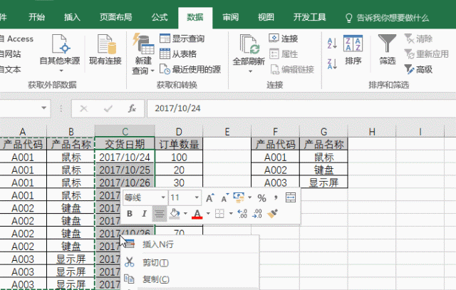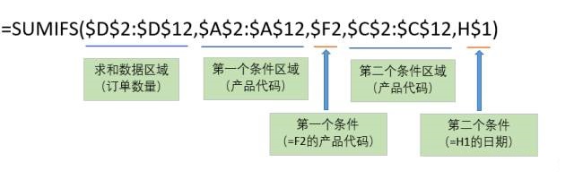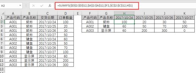 公式中F2使用混合引用$F2,目的是公式向右填充时条件一都出自F列,即产品代码列;H1使用混合引用H$1,目的是公式向下填充时条件二都出自第一行,即日期行。