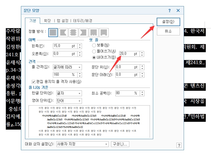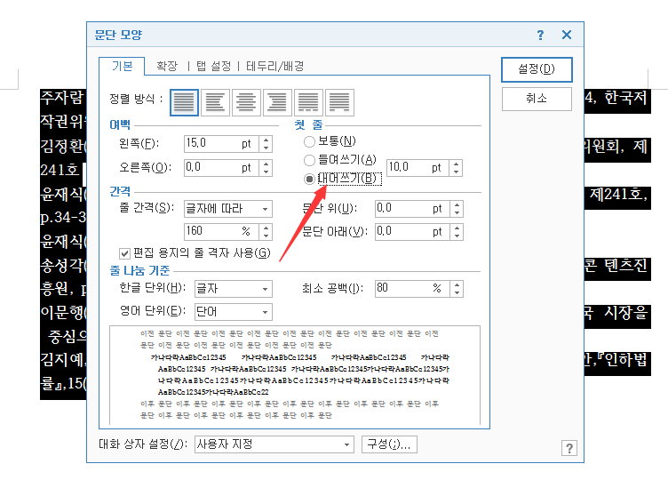 “悬挂缩进(내어쓰기),即第一行顶格书写,第二行起开始缩进,以调整文字和段落的位置。”