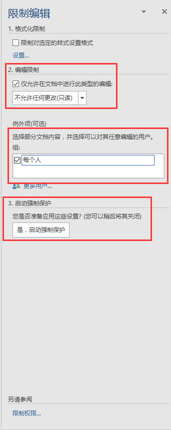 (文件-信息-保护文档-限制编辑),wps界面右侧将会出现如下所示的设置框: