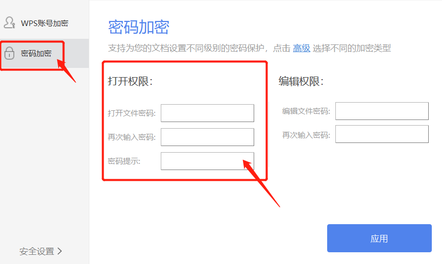 密码加密:打开权限时的密码,指打开时的密码; 编辑权限,指你打开后,编辑表格录入的密码。一般平时给朋友或同事的表格,加密在这里设就可以,不要WPS账号加密,WPS账号加密后,你发给你朋友是打不开的。