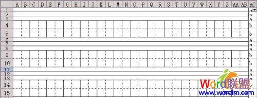 在边界线外的单元格AC1:AC3中输入a,在AC4:AC5中输入b。然后选择AC1:AC5并拖动填充手柄将其向下填充到页脚。这样,拼音网格线的末端对应于A,田字格线的末端对应于B.