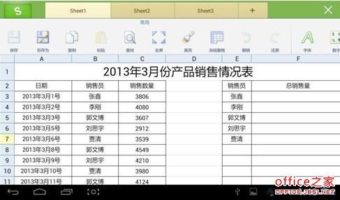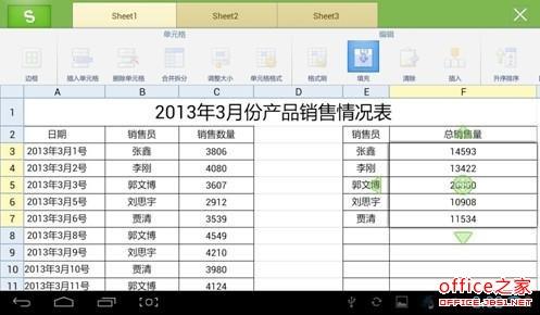 在上表中,每个销售人员3月份的销售数量是按日期记录的。为了一目了然地看到每个员工3月份的总销售额,可以借助SUMIF功能在WPS Mobile Edition中计算每个销售人员的总销售额。