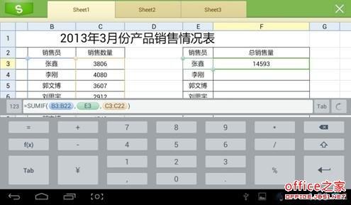 接下来,在WPS Mobile Edition的内置键盘的函数格式列中输入=sumif (b3:b22,E3,c:c22),其中函数中的3(B3和c3)代表表中人员列表的第一行,b22和c22中的22代表最后一行。确保输入正确后,单击回车键。这时,边肖看到销售员张馨3月份的总销售额是14593。