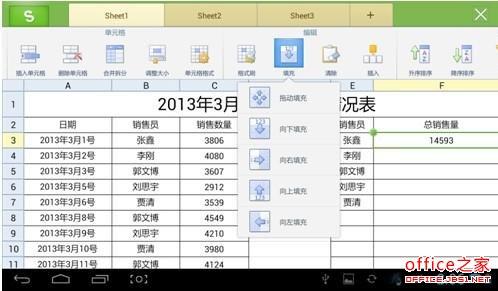 在WPS移动版的菜单导航栏上向左滑动手指,找到“填充”按钮,单击并选择“拖动填充”。当边肖用手指拖动向下的虚拟箭头时,表格中其他四名销售人员的总销售额就会自动计算出来。