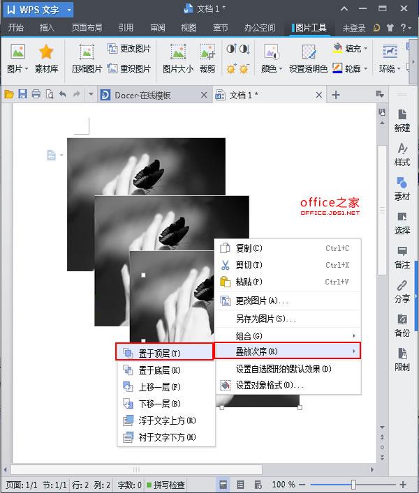 创建新文档,插入图片,然后右键单击图片“格式化对象”。在对话框中,选择文本底部的版式,然后返回文档复制并粘贴图片,右键单击每张图片,选择顶层的堆叠顺序。这样,你就会看到层层叠加的效果。