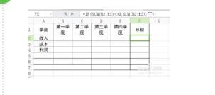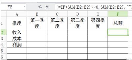 6 细心的朋友,可能会通上面几张图看出F2中的公式和最初图中显示的公式不同。图中有0时,F2的公式是=SUM(B1:E2),而图中无0时,F2的公式却是=IF(SUM(B2:E2)<>0,SUM(B2:E2),””),那么公式=IF(SUM(B2:E2)<>0,SUM(B2:E2),””)有什么含义呢?