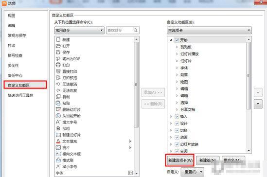 2、在弹出PPT选项窗口,选择【自定义功能区】——【新建选项卡】;