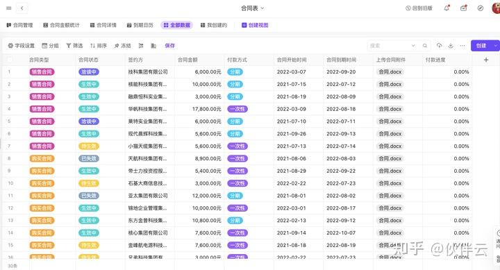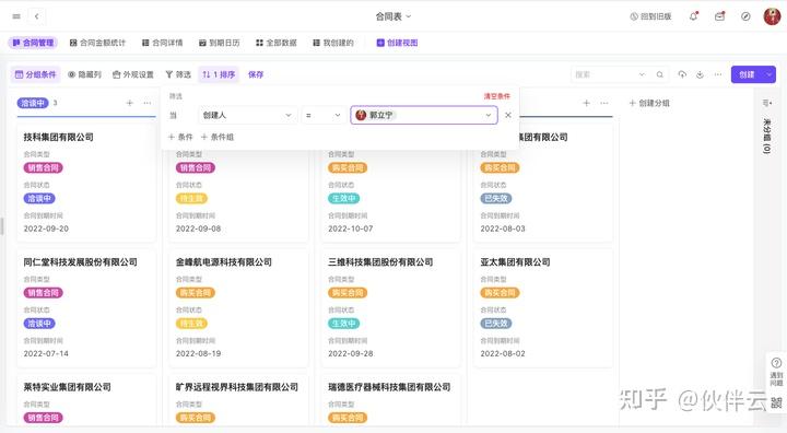 如果某名员工签约的合同较多,通过添加筛选条件,如创建人=xxx,就可以查看该员工手头上的所有合同状态了,非常方便。