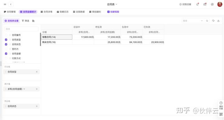 此外,利用透视表视图,只需将鼠标自定义拖动字段到行分组和列分组,就能自动汇总包括销售合同、购买合同在内的金额,像洽谈中、待生效、生效中、已失效....不同状态下的合同金额,也能分分钟帮你计算清楚。