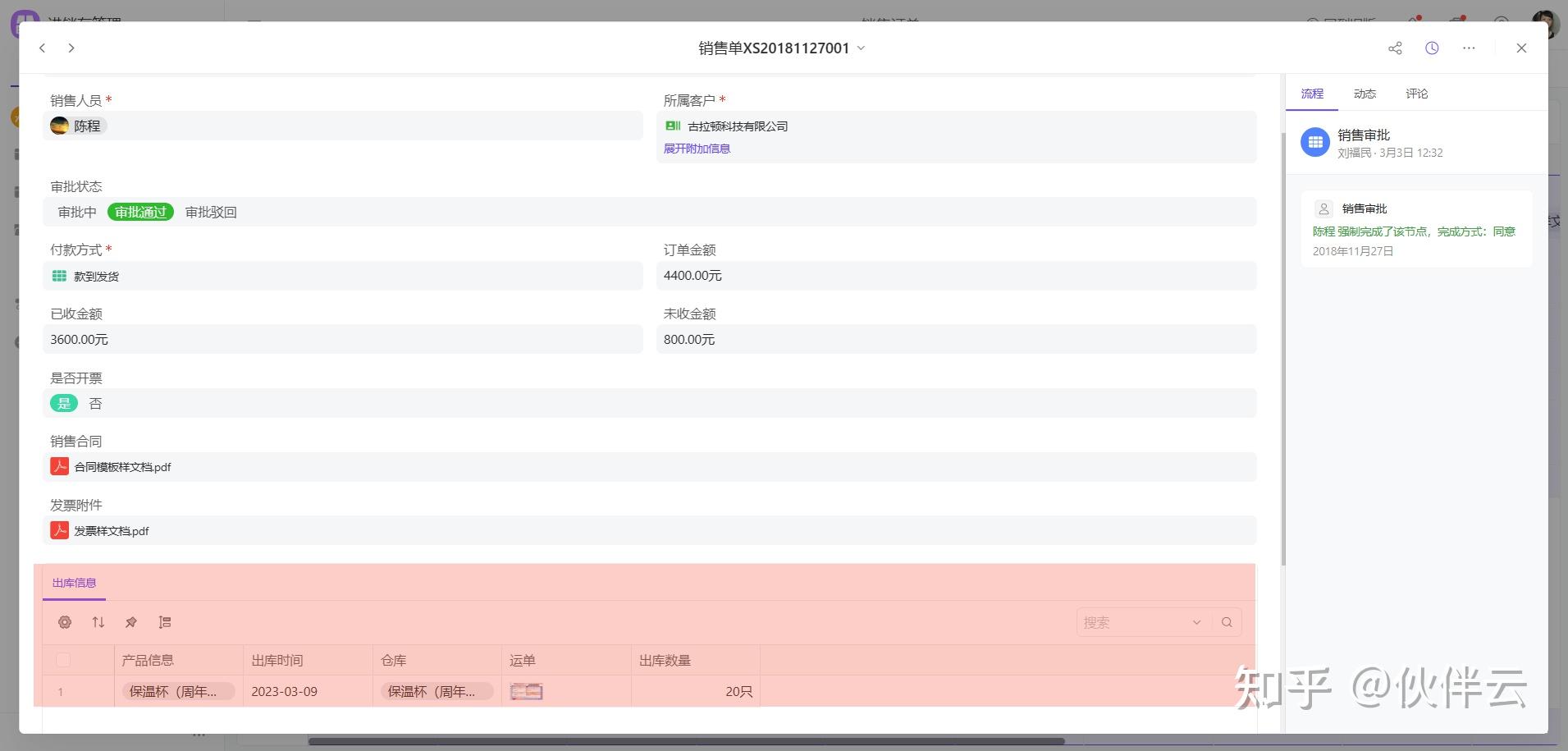 打开销售订单即可实时查看流程审批进度,订单审批通过后可在下方查看货品出库、发货情况。