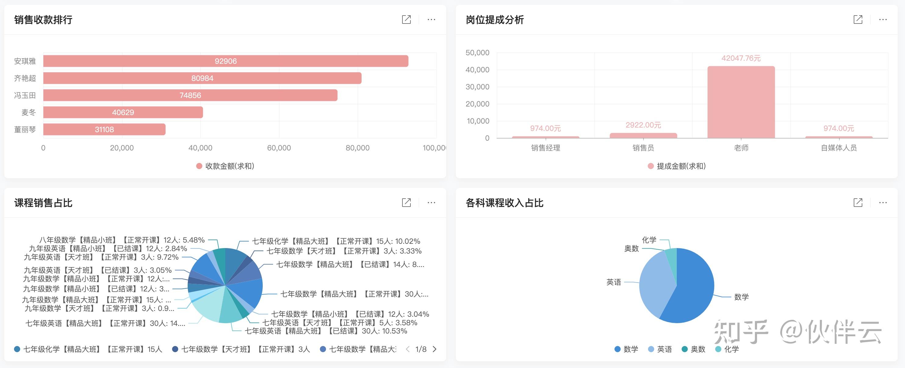 销售收款排行、课程销售占比、收款趋势等销售数据清晰直观,招生情况全面掌控。