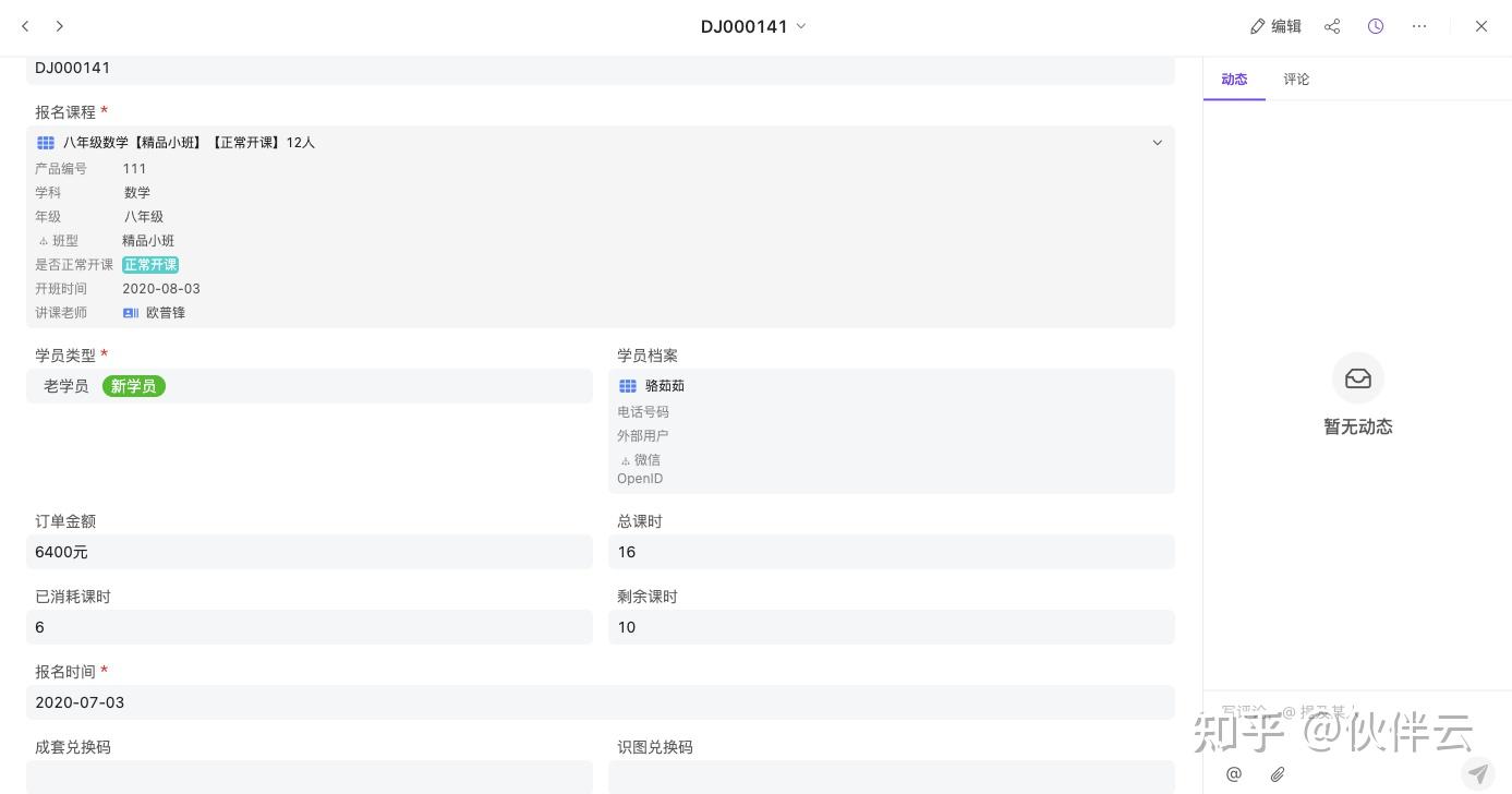 伙伴云教育管理系统,可以根据学员的实际考勤数据自动计算学员的课时,并根据课时消耗给出课时余量警告,同时根据学员的实际成长情况,推荐下一阶段的补习课时和补习内容。