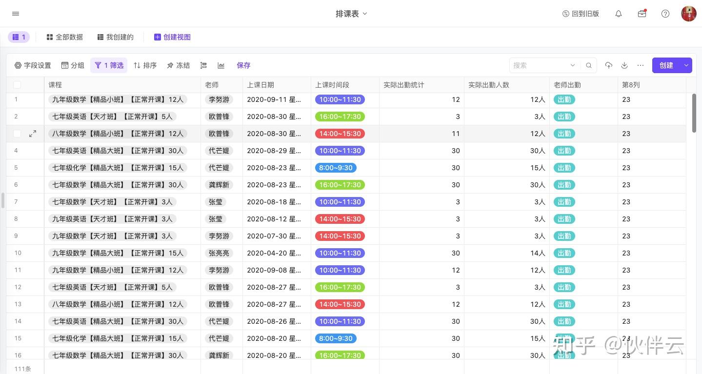 使用伙伴云建立课程产品库后,可以通过人工排课,设置验证以防撞课现象的发生;还可直接设置系统进行自动排课,系统会根据老师的意向上课时间段、上课科目、课程……