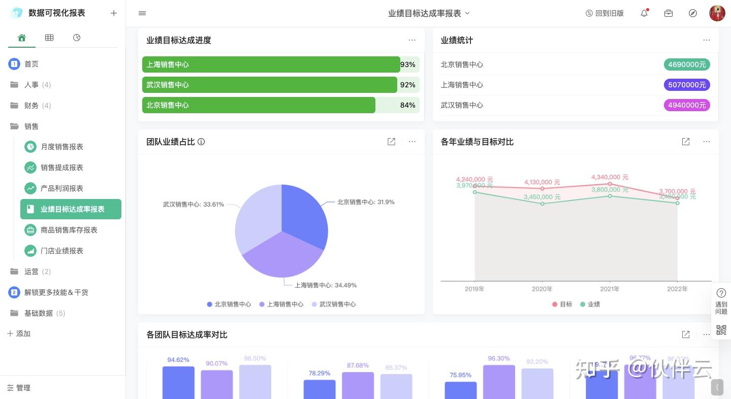 而你只需要拿出一张年终报表,今年业绩与去年同比增加了多少,销售团队在整个大区中的排名是多少,今年的回款额是多少,年初目标完成进度达230%......所有数据对比一目了然。