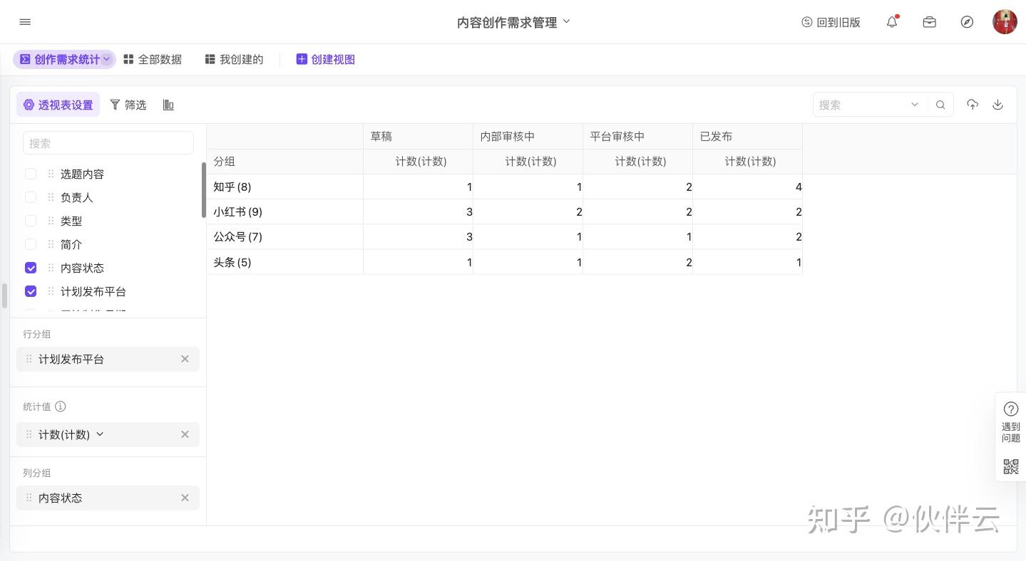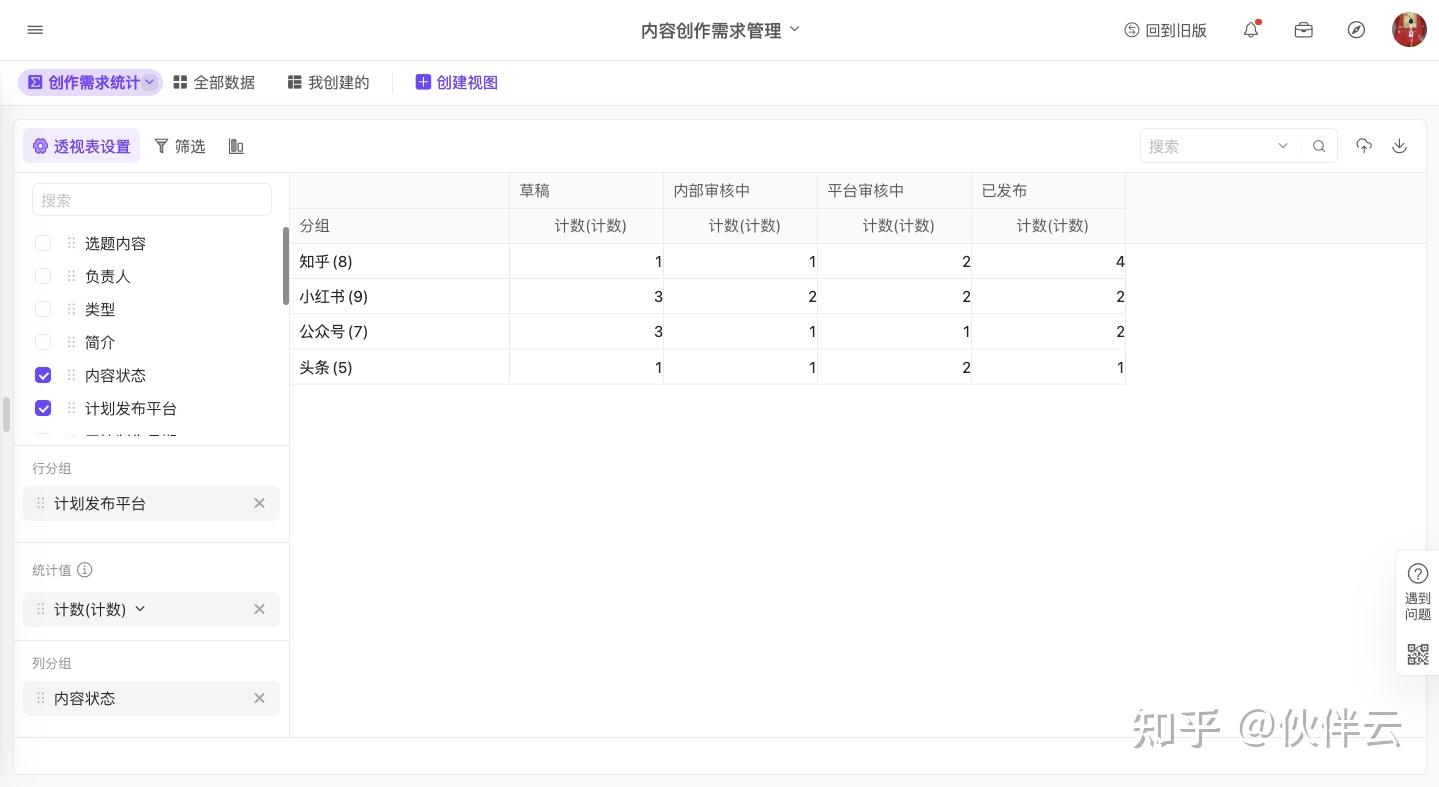 创作需求统计:鼠标拖动相应字段到行/列分组,即可自动汇总统计不同平台审核内容的数量。