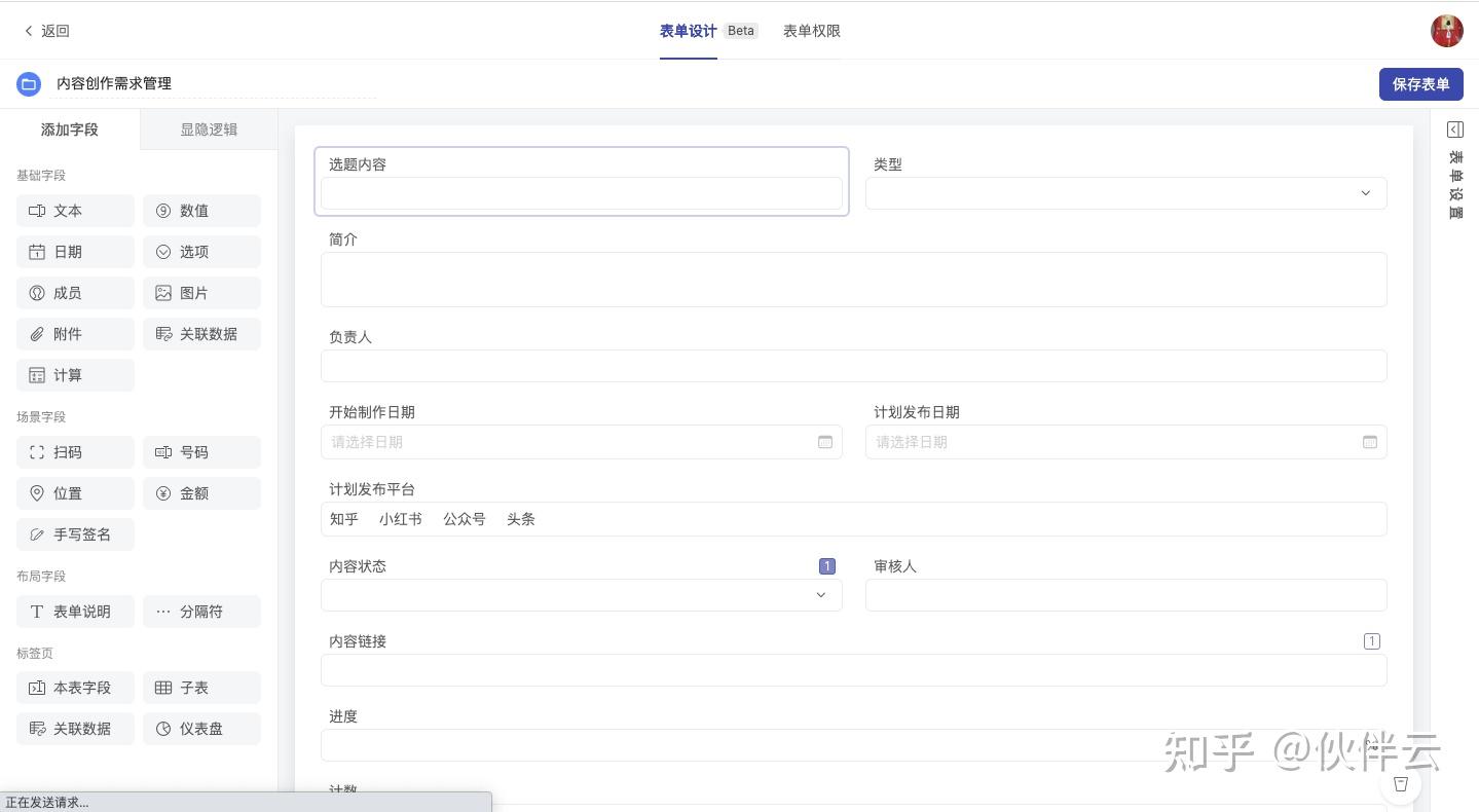 安装成功后,点选“表格”按钮,可以看到该模版中的所有表格配置情况,这里我们以“内容创作需求管理”场景为例。