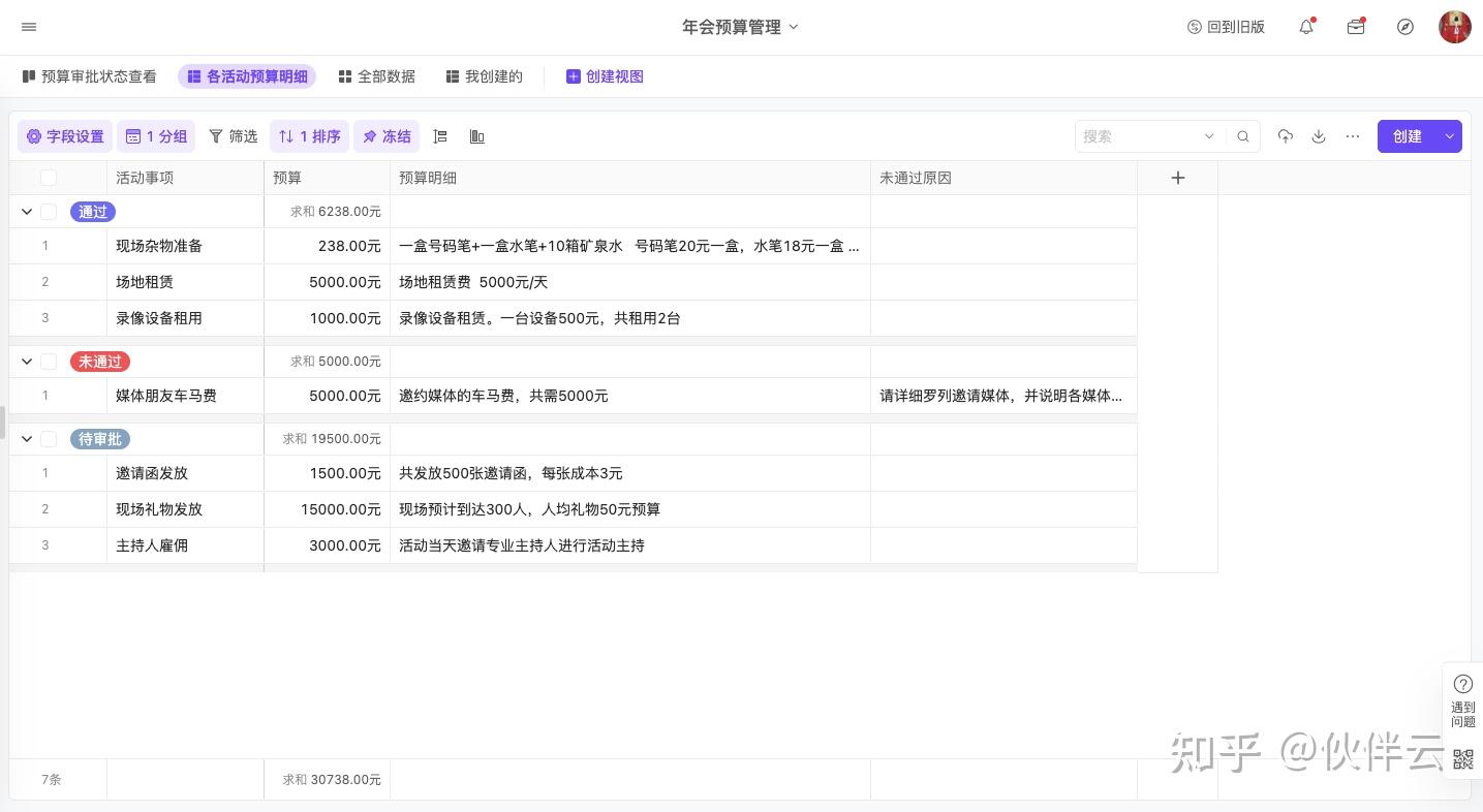 如果按照预算状态分组,还可以自动汇总当前状态下的活动预算总数,这样对每笔预算都能做到心中有数。