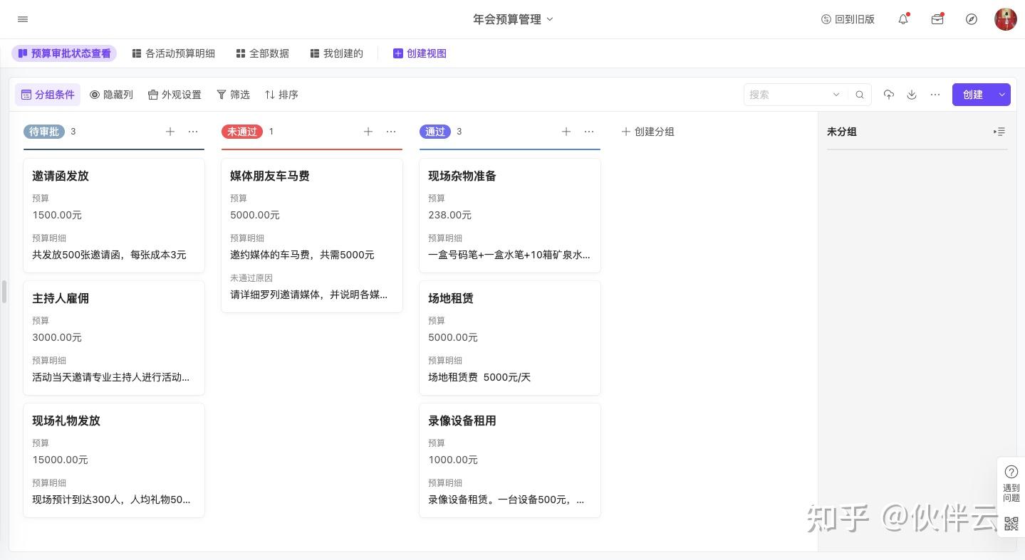 通过该模板,行政可以对年会活动预算进行填写申请,通过看板可以清晰的查看预算审批的状态。