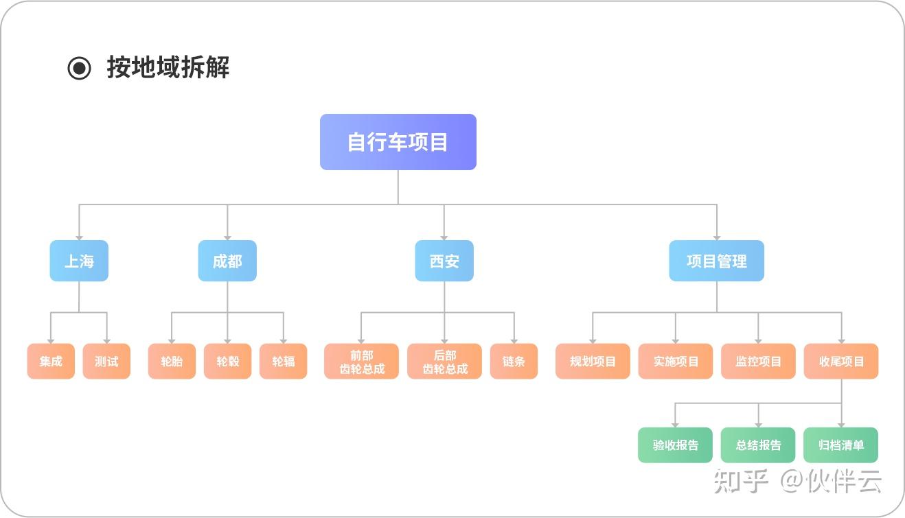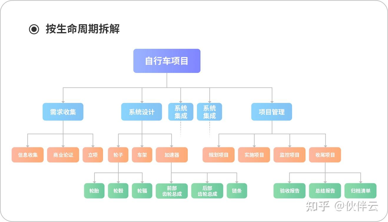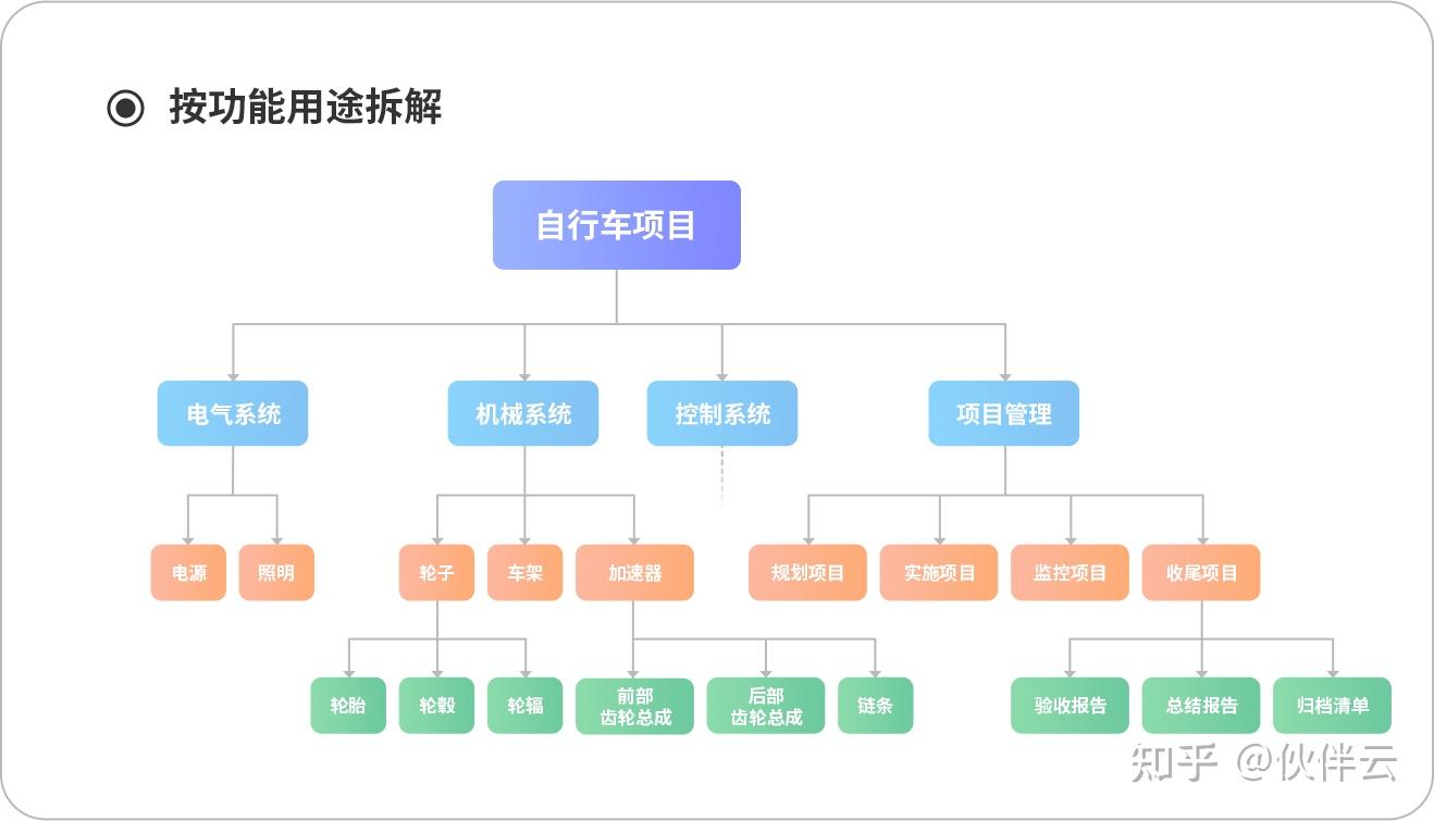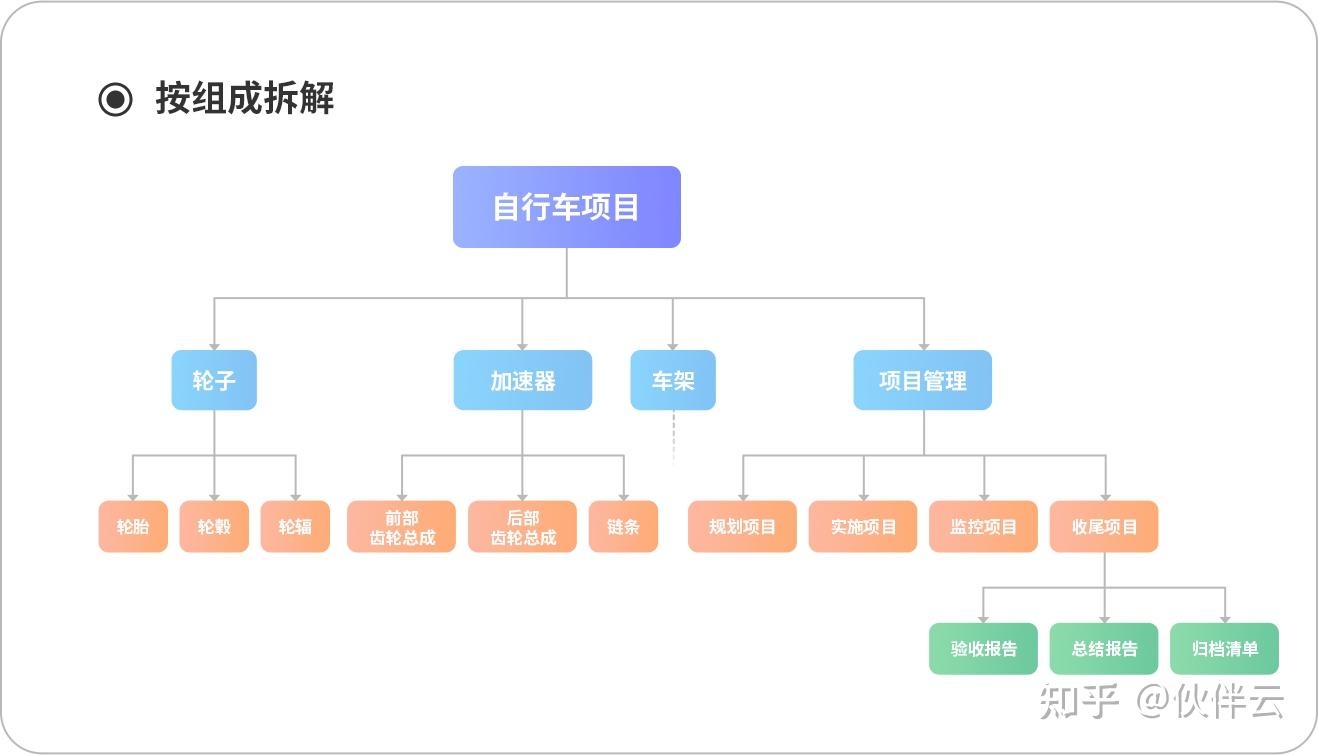 按组成拆:一辆自行车可分为轮子、加速器、变速器、车架及拆自行车这个项目的项目管理。