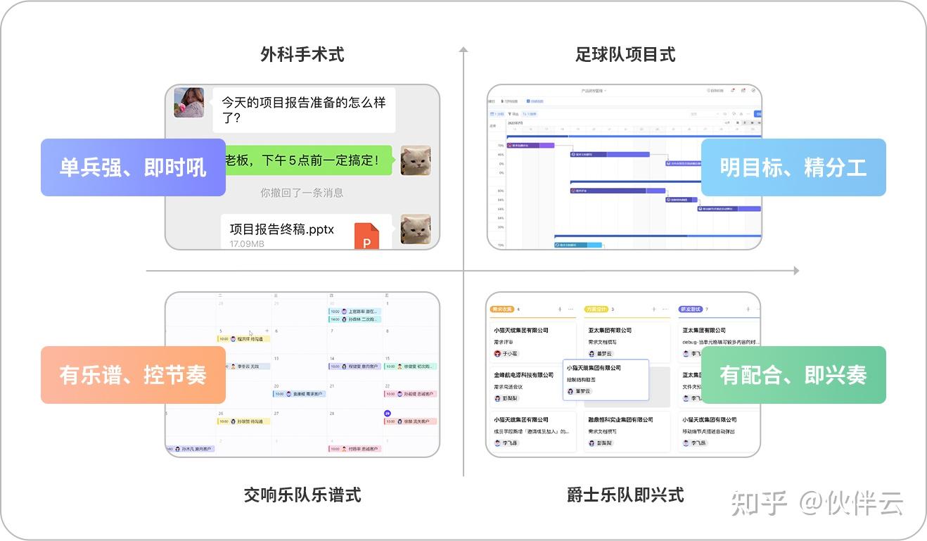 项目团队的组织方式有很多种,但基本上可以归为外科手术式、交响乐队式、爵士乐队式和足球队式四种,不同的团队对应不同的执行方式。