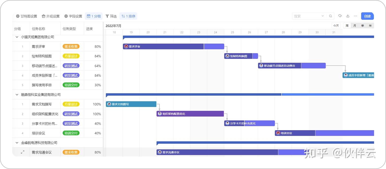 而在伙伴云,一旦建好关键路径,如果一个任务延期,后面所有与他关联的任务会一起变,任务排布状态实时更新。