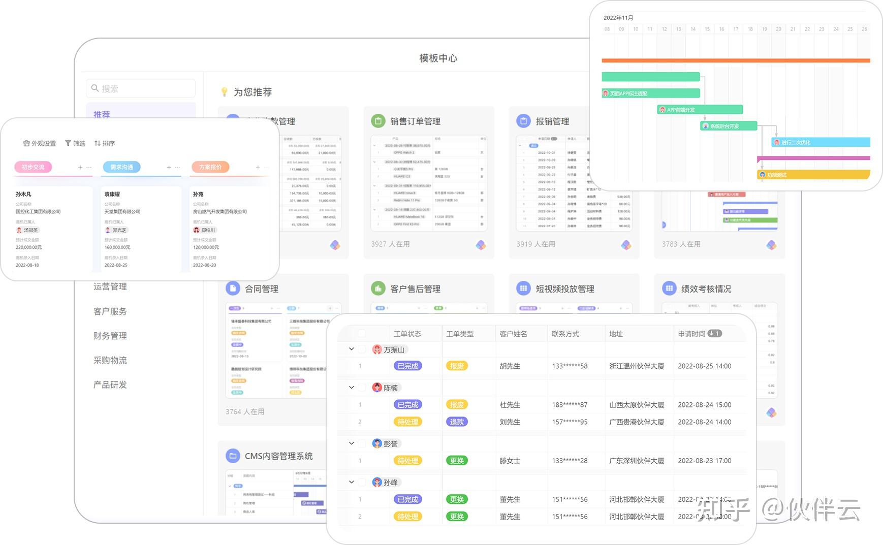 伙伴云不仅是一个武装到牙齿的工具,还支持从数据输入、协作、流转、分析到输出全过程实现完全低代码化的应用搭建和引擎配置。>>>我们提供数百个不同的模板,比如产品研发管理、bug 跟踪、招聘面试日历、设计项目管理、市场部活动计划看板等。这些模板背后包含了大量项目管理的实践经验。