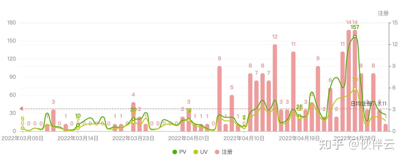 折线图通常会与其他图形结合使用(与柱状图结合、与面积图结合等)。下面是折线图与柱状图相结合的一个简单例子,柱状图表示 2022年3月-4月的线索注册数,折线图表示PV、UV的变化趋势。