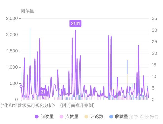 现在可以明显的看出柱状图在处理大数据集时的劣势:很难对每篇内容做明确区分,多种文章内容挤在一起,无法区分出内容之间的数据对比。