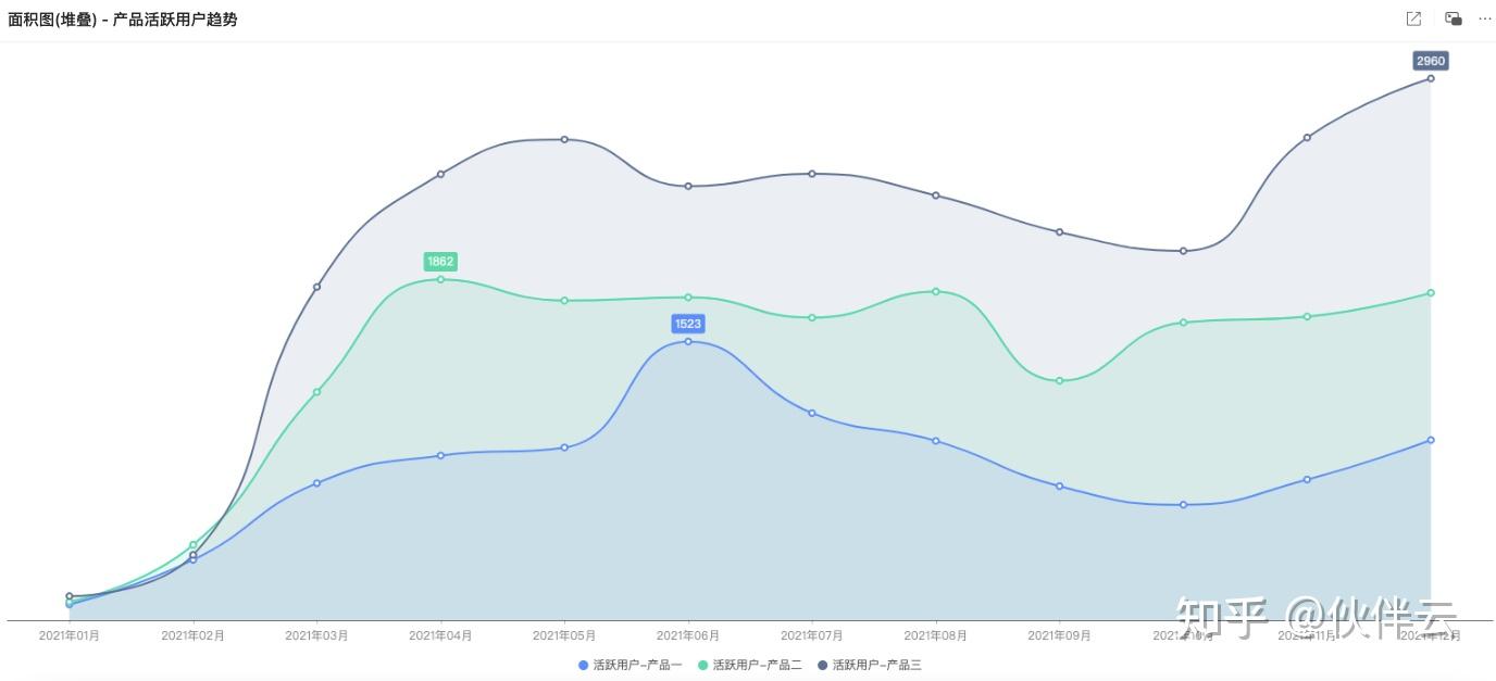 面积图。用面积展示数值大小。展示数量随时间变化的趋势。堆积面积图。同类别各变量和不同类别变量总和差异。百分比堆积面积图。比较同类别的各个变量的比例差异。