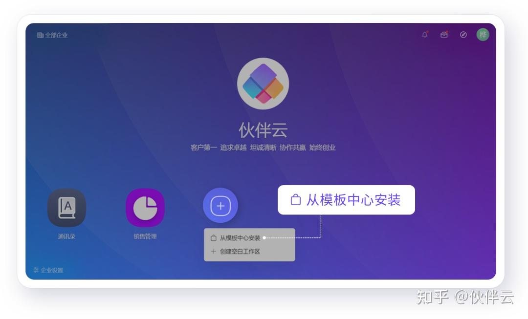 在企业空间中,点击“+”号创建工作区,选择“从模板中心安装”。