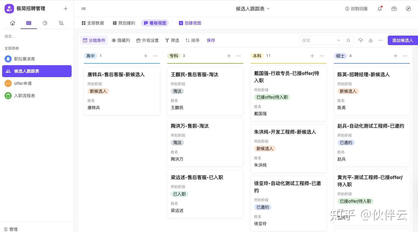 HR或者部门负责人可以通过看板视图对当前候选人按照“学历”等条件进行分组,这样就可以直观的对候选人进行对比判断,选择岗位最匹配的人才。