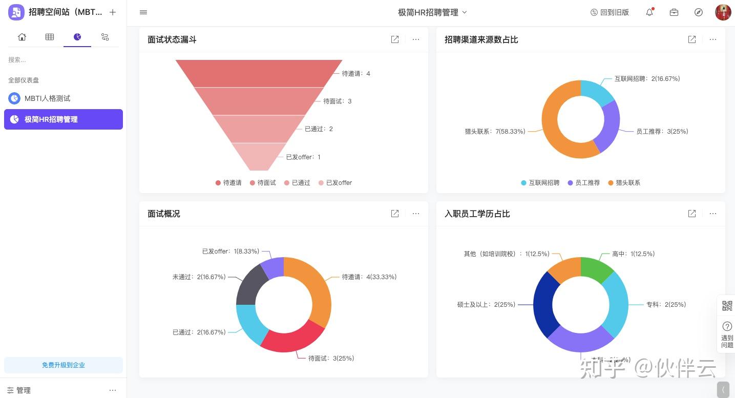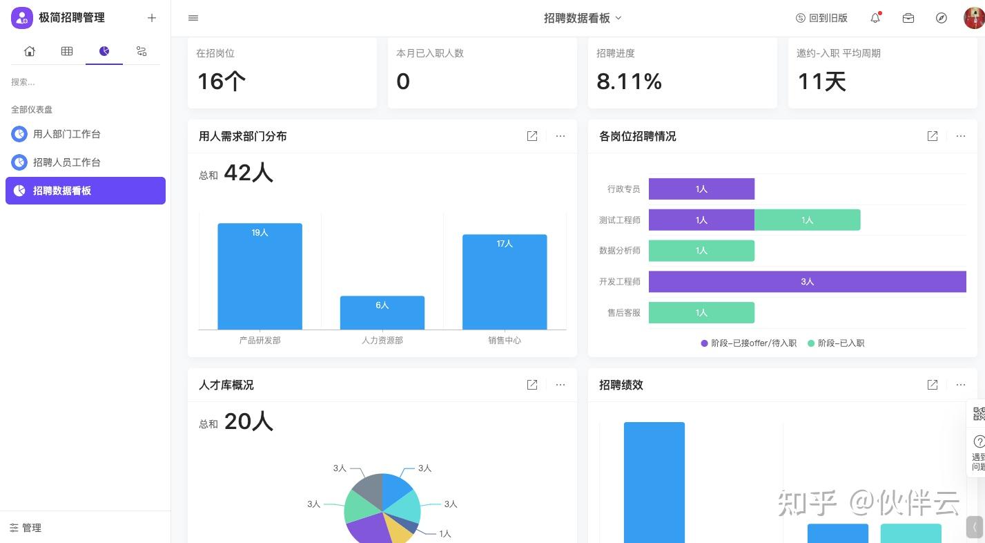 伙伴云数据分析仪表盘可以实时进行汇总分析本周/月的招聘数据、约面人数、面试通过数.....HR不用加班加点手动做表,就可以相应的分析面试进程中哪里做的好,哪里可能有问题,从而调整招聘的节奏了。