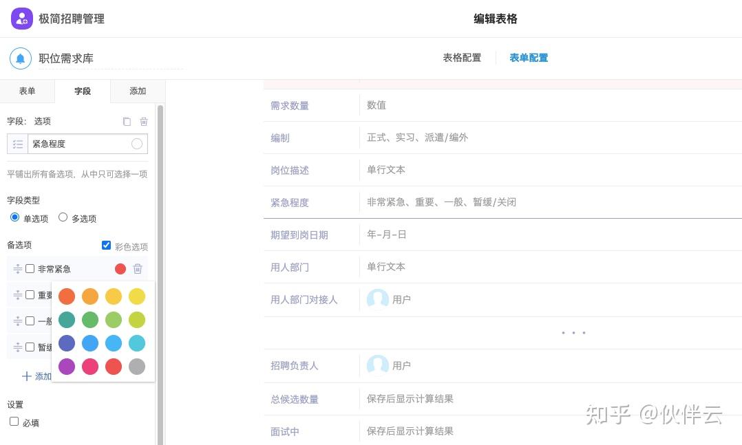 系统支持不同颜色标注多选字段,如岗位紧急程度中,非常紧急的可用红色标注。
