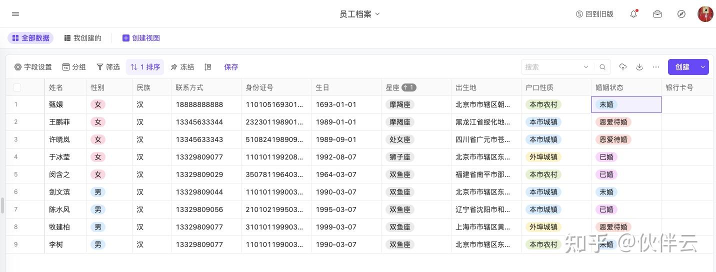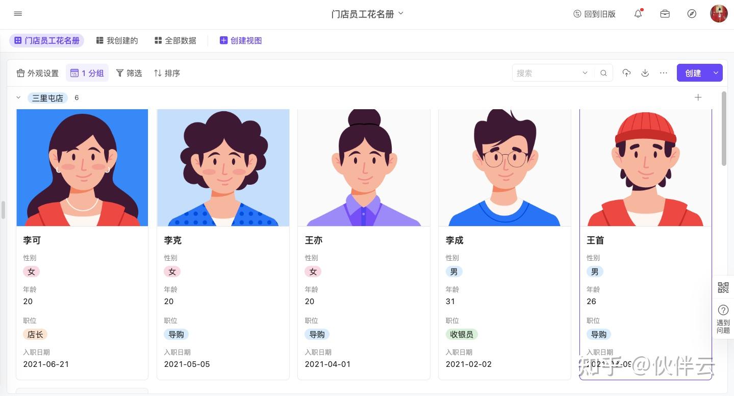 用伙伴云「卡片视图」管理人员资料,一键展示照片+关键信息,打造“智能花名册”,实现人事档案实现自动查询,人员流动大也不怕!