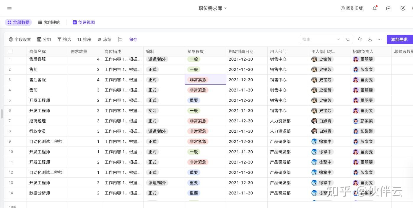 当部门有招聘需求时,HR只需在系统中录入一条招聘需求信息,包括岗位名称、需求数量、岗位描述、紧急程度、期望到岗日期、用人部门...如图所示。