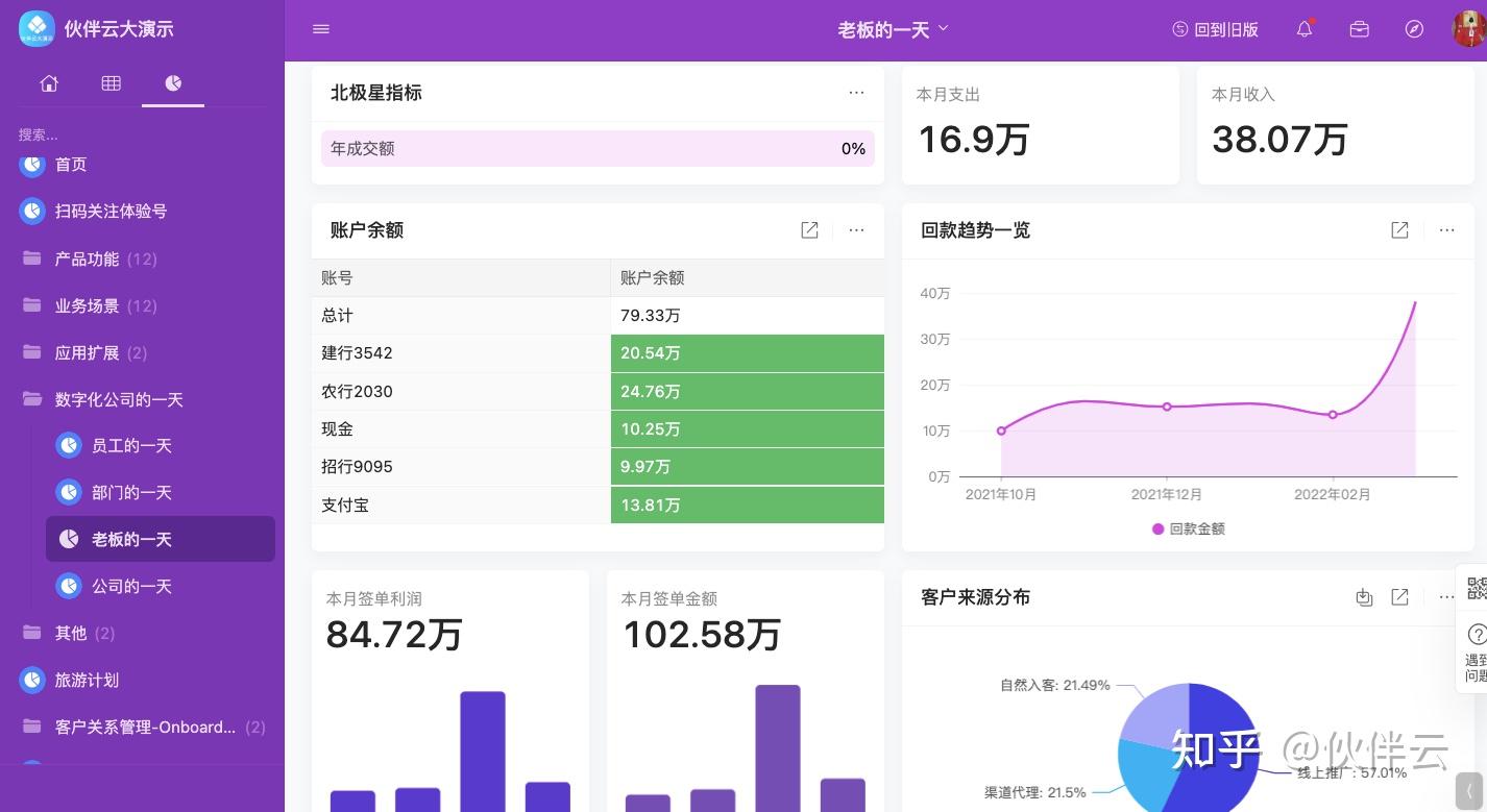 通过伙伴云自定义配置仪表盘,生成动态可视化报表。老板每天只花几分钟便可掌握客户、销售、收入、成本等各种经营指标。如果有异常情况,还可以标红进行预警,实现企业动态监管,让管理者根据直观的数据作出科学的决策。