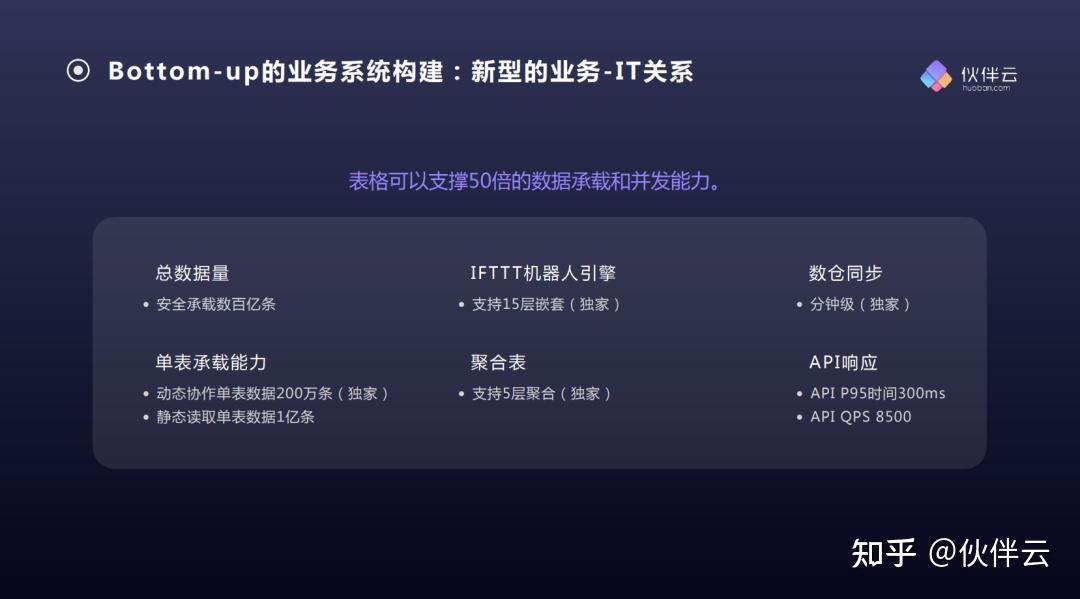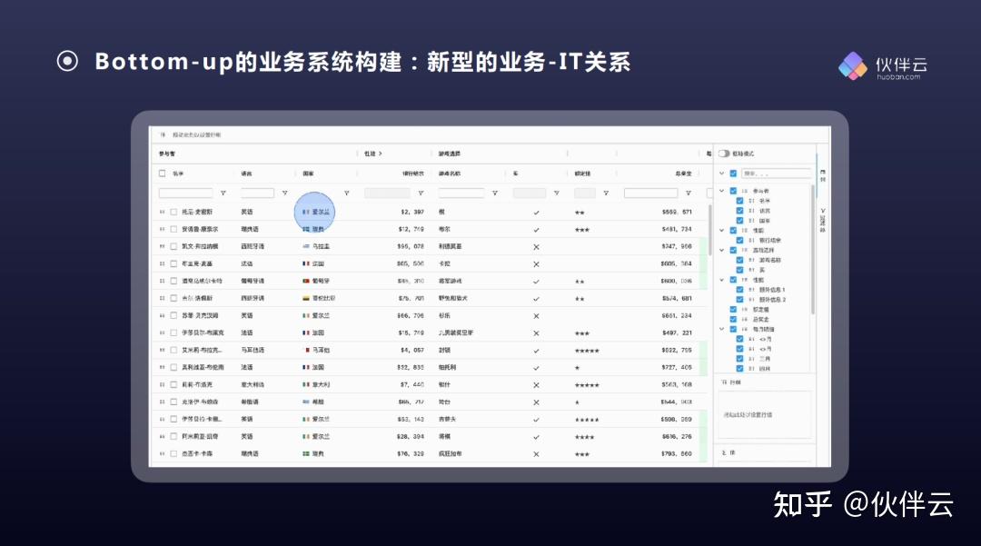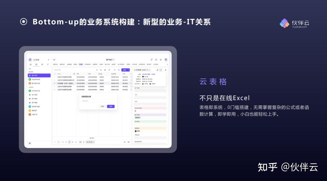 其实很多企业里,一个订单表或者一个客户表,就已经是一个系统。在伙伴云,可以通过鼠标拖拉拽的形式,把原来很混乱的业务诉求实现出来。bottom-up的业务系统,通常是从一张表开始的。这张表不断延伸,从无到有地构建出一个企业信息化的系统。