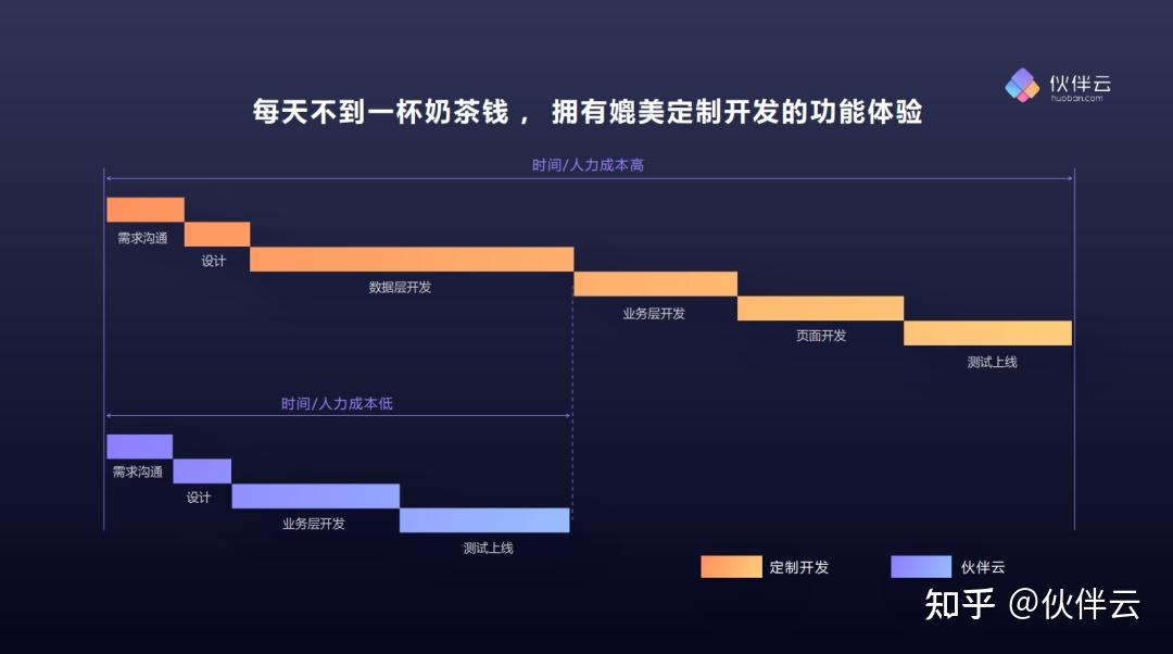 传统意义上讲,定制开发一个IT系统,总的时间成本、人力成本基本上10倍于用低代码开发。也就是说每天用不到一杯奶茶的钱,就可以拥有一个媲美定制开发的功能体验。