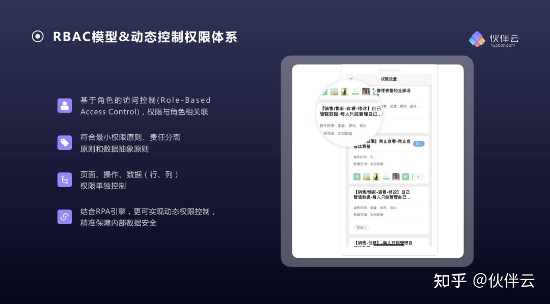 以及刚才提到的RBAC(role based access control),即角色和动态相关联的权限系统。企业需要绩效核算,最理想的绩效是让每一个员工直接看到自己当期的实时绩效,伙伴云可以帮助实现这一点。