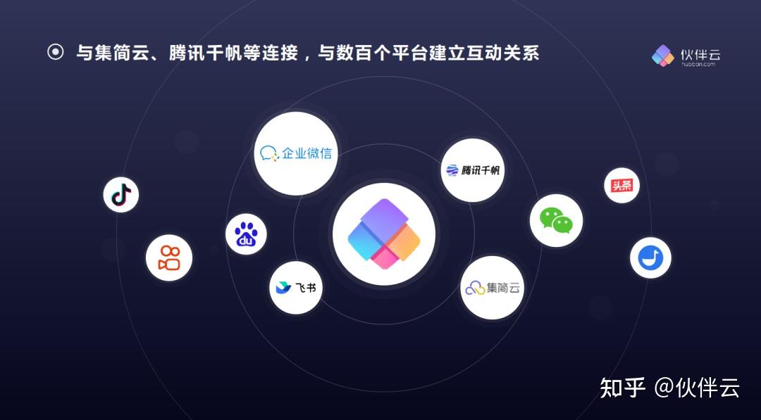 我们通过更好的连接性,实现了上千个 SaaS 应用的接入。我们接入了企业微信和飞书的生态,能够把企业微信、飞书的数据完整同步到伙伴云里来。同时又接入了极简云和腾讯千帆,把更多的 SaaS 应用接入进来。
