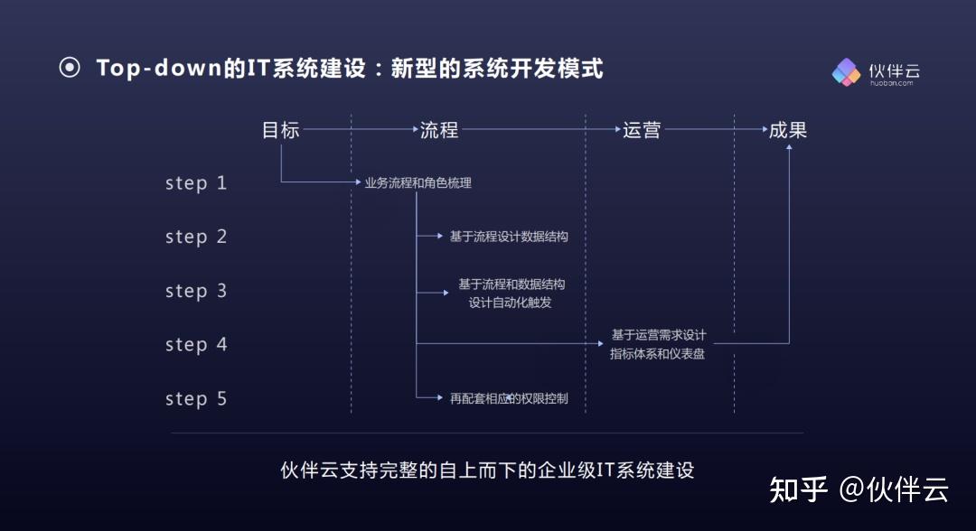 接下来我们来说自上而下的IT系统建设,低代码也能提供新型的系统开发模式。我们基于一个战略或者目标,对业务流程和业务中的角色进行梳理。梳理出了角色后,再基于流程设计数据结构,把ER 图设计出来。同时基于流程和数据结构,设计自动化触发和自动化数据处理能力。然后基于运营需求设计指标体系和仪表盘,同时再配相应的权限控制,指导我们去达成战略目标所设定的预期成果。