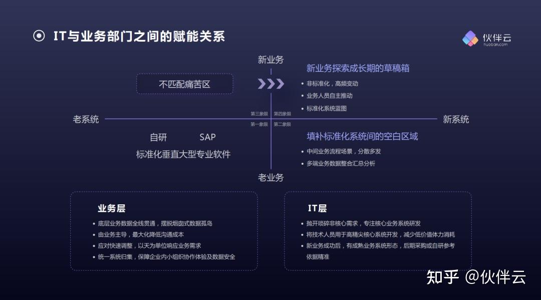 我们把企业的业务分成四个象限,以老系统和新系统为横轴,老业务和新业务为纵轴,分出四个象限。对于老业务和老系统,比如企业一些自有核心系统,ERP、MRP、MES等等。这部分系统,低代码既不想要,也不能够替代这部分需求。但当老系统碰到了新业务时,它就会产生不匹配的痛苦区。