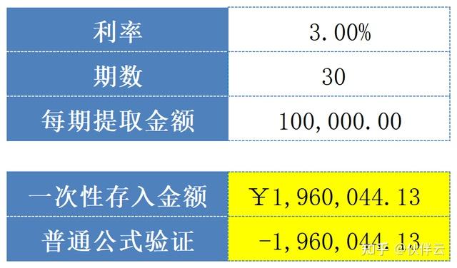 举例 :小乔有一笔钱存入银行,银行1年期定期存款利率为3%,希望在之后的30年内,每年从银行取10万元,直到将全部存款取完,小乔现在需要存入多少钱呢?