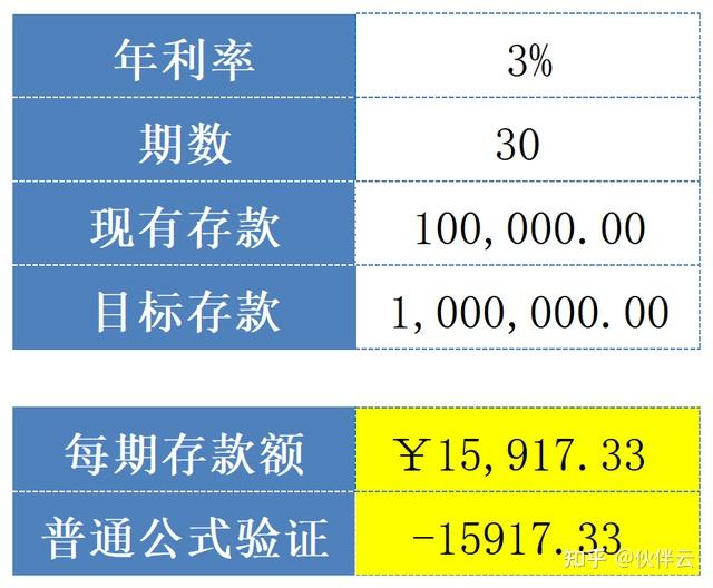 举例 :银行1年期定期存款利率为:3%。小乔现有存款10万元,如果希望在30年后,个人银行存款可以达到100万元,那么小乔在这30年中,需要每年向银行存款多少钱呢?