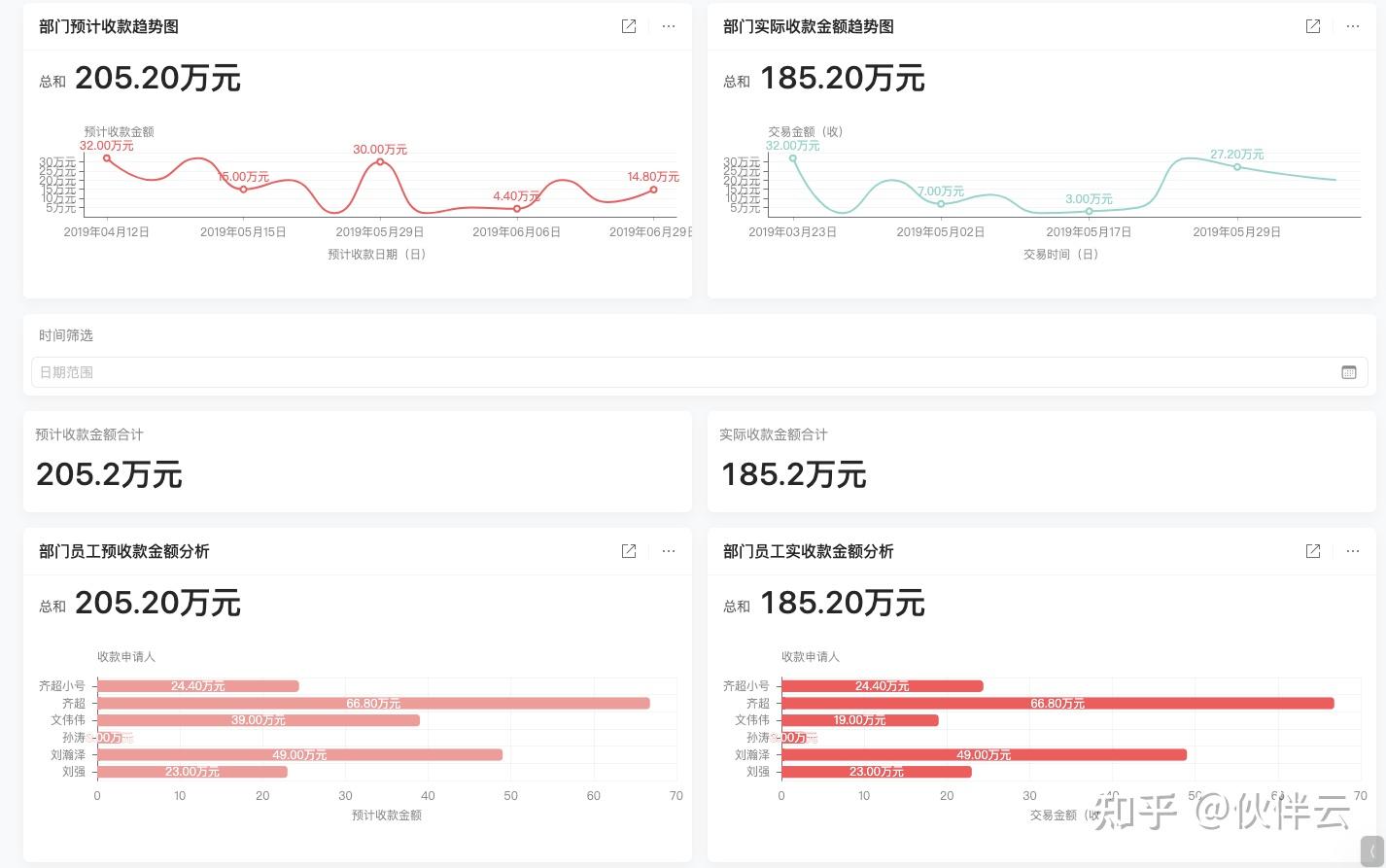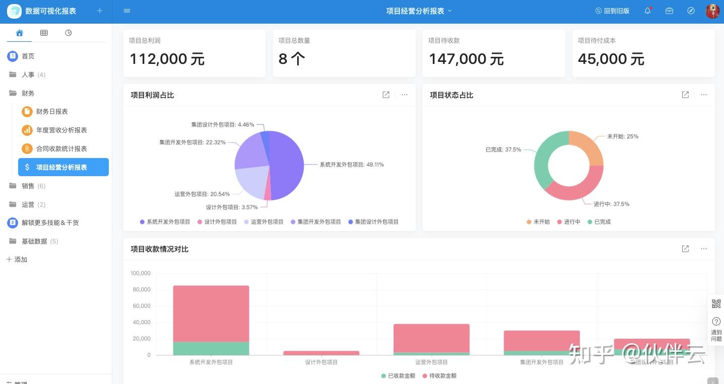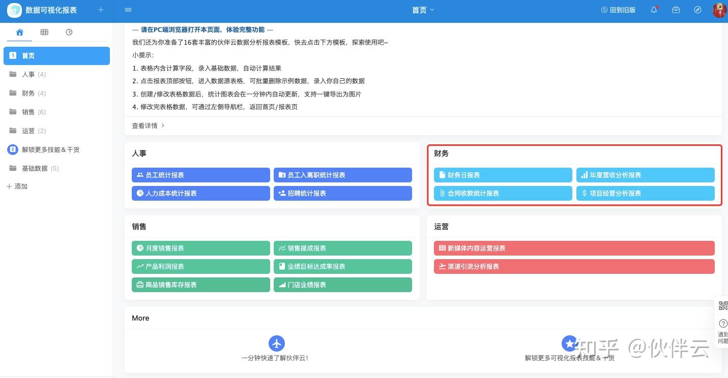 下面就是小编通过伙伴云数据可视化报表模版制作的财务报表,里面涵盖了财务日报表、年度营收分析报表、合同收款统计报表、项目经营分析报表...分析维度。